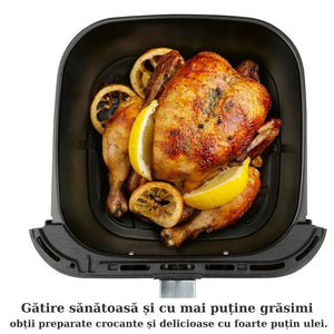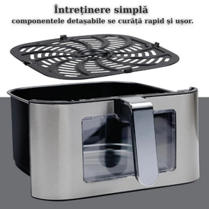 Datorită tehnologiei de circulare a aerului fierbinte, alimentele sunt preparate sănătos, păstrând aroma și textura, fără exces de grăsimi. Fereastra transparentă integrată îți permite să supraveghezi procesul de gătire fără a deschide aparatul, menținând temperatura constantă în interior.