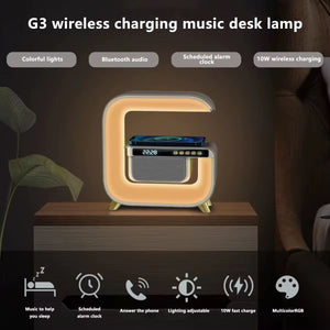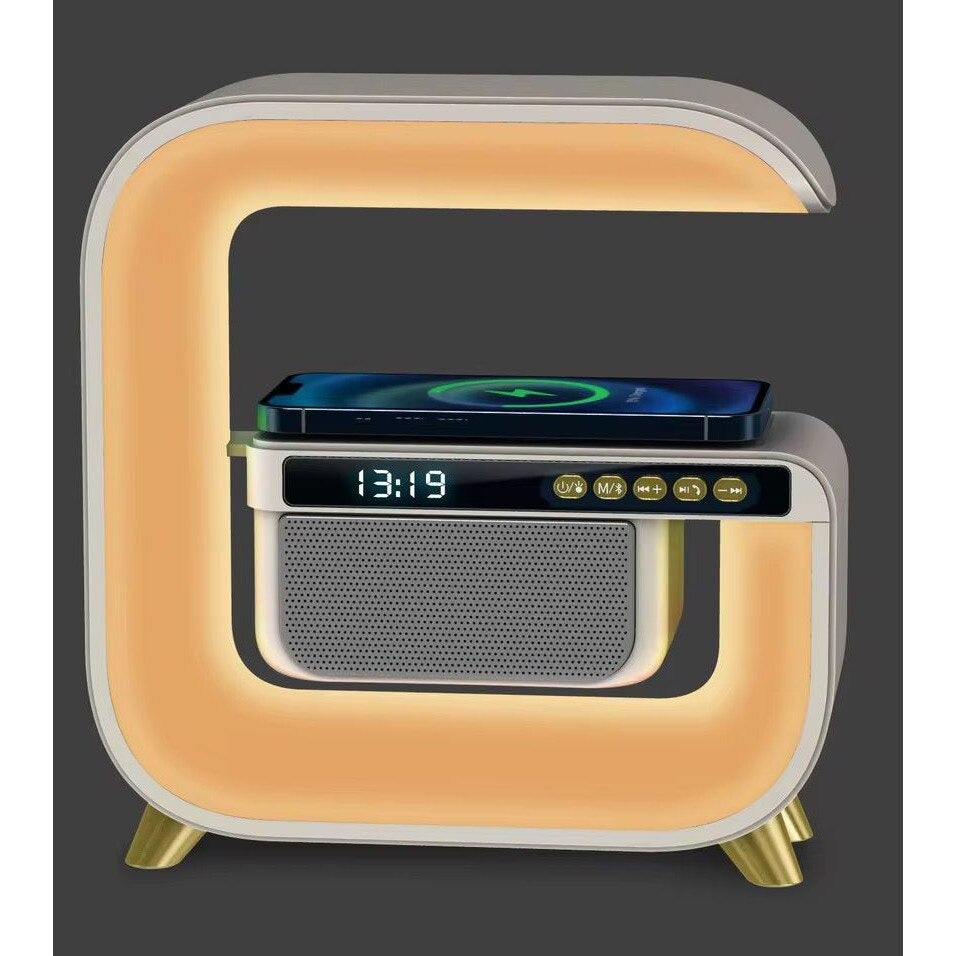 Lampa smart LED multifuncțională în formă G pătrat este un accesoriu modern și versatil, ideal pentru dormitor, birou sau spații de relaxare. Aceasta combină iluminarea ambientală inteligentă cu funcții utile precum încărcare rapidă wireless , ceas digital cu alarmă, boxă Bluetooth și simulare a răsăritului, oferind confort și funcționalitate într-un singur produs.