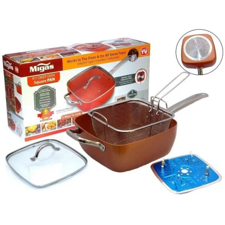 Descopera setul de tigai multifunctionale 5 piese, patrata, cu suprafata non-aderenta si finisaj elegant de cupru. Ideal pentru gatit sanatos si rapid, acest set versatil poate fi folosit ca tigaie, cratita, friteuza, tava sau vas pentru fiert paste. Peretii inalti previn stropirea mancarii, iar suprafata patrata mare permite gatirea mai multor portii simultan: 4 felii de paine, 8 pulpe de pui, 10 felii de cotlet sau 20 de carnaciori.